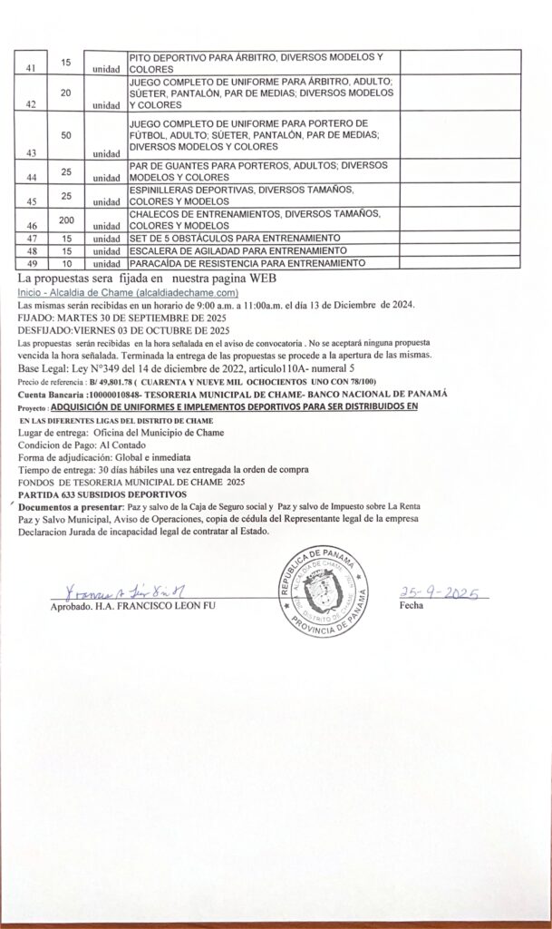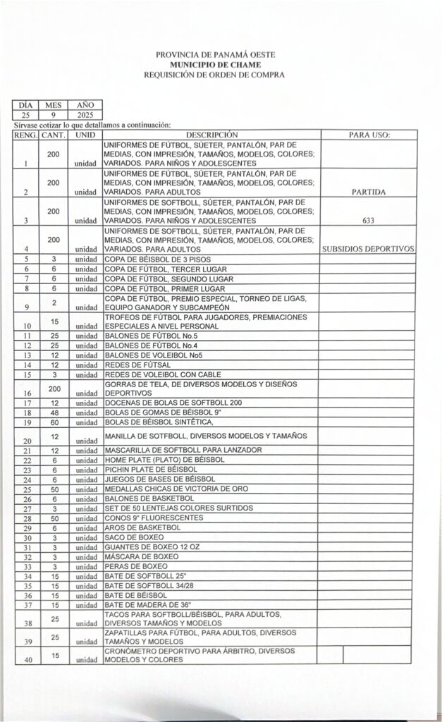 ADQUISICIÓN DE UNIFORMES E IMPLEMTOS DEPORTIVOS PARA LAS DIFERENTES LIGAS DEL DISTRITO DE CHAME.